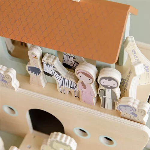 De houten speelgoed ark heeft een deur die naar beneden klapt en een dak dat open kan, zodat alle dieren makkelijk in de boot kunnen worden geplaatst.