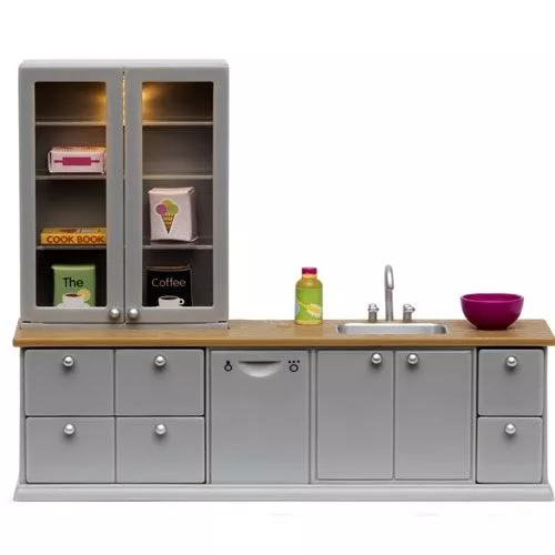 Een sfeervol en modern keukenblok met ingebouwde vaatwasser van het Zweedse merk Lundby voor het poppenhuis. Verder beschikt deze keuken over een gootsteenkastje, zes ruime keukenladen én een vitrinekast met verlichting! Hier gaan culinaire poppen veel tijd doorbrengen.