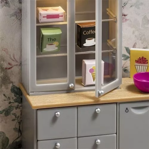 Inbegrepen zijn ook de afgebeelde accessoires, zoals een flacon afwasmiddel, een pak koffie en een roze mengkom.