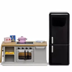 Een praktisch en functioneel vormgegeven kookeiland met oven en kookplaat van het Zweedse merk Lundby voor het poppenhuis. De oven beschikt zellfs over een ovenlampje! Uiteraard is het poppenhuiskookeiland niet compleet zonder koel- en vriescombinatie in de vorm van een grote retro koelkast.