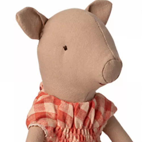 Een onweerstaanbaar knuffelvarkentje ‘Pig’ van het Deense merk Maileg met een geruit jurkje.