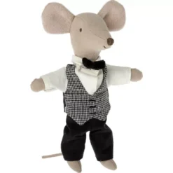 Knuffelmuis ‘Waiter Mouse’ van het Deense merk Maileg helpt graag in luxe restaurants of grote evenementen. Zijn nette uniform bestaat uit een zwarte pantalon, witte blouse met daaroverheen een colbertje en zwart strikje.