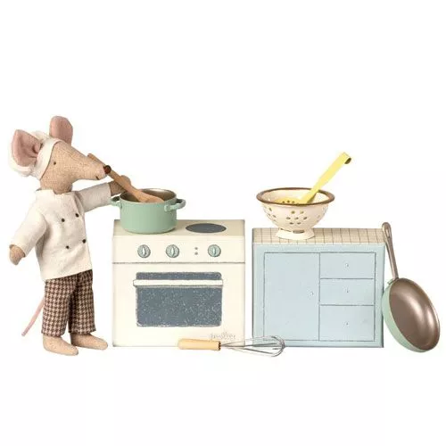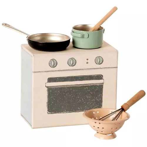 Een kartonnen, retro poppenhuisfornuis met kookgerei van metaal en emaille ‘Cooking set’ van het Deense merk Maileg voor de keukenprinsen en -prinsessen knuffels.