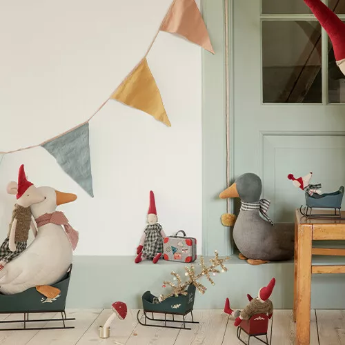 De knuffeltjes genieten comfortabel van de sneeuw in deze grote houten slee. De ‘Sleigh – Mouse – Green’ van het Deense merk Maileg is er voor kleine knuffeltjes die houden van sneeuwpret.