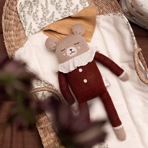 Een knuffelbeer ‘Big Teddy Soft Toy, Sienna Pyjamas’ van het Franse merk Main Sauvage. Een beer van flink formaat om heerlijk mee te knuffelen. De handgebreide lappenpop van baby alpaca wol draagt een bordeauxrode pyjama.