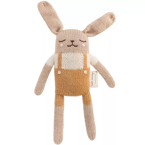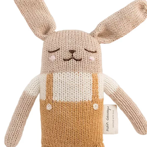 Voor de allerkleinsten een zacht knuffelkonijntje ‘Bunny Knit Toy, Ochre Overalls’ van het Franse merk Main Sauvage. Met zijn grote oren en stijlvolle outfit is dit konijn een echte hartendief. De handgebreide lappenpop van baby alpaca wol draagt een wit shirtje en mosterdgele tuinbroek.