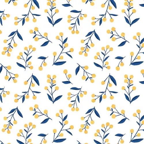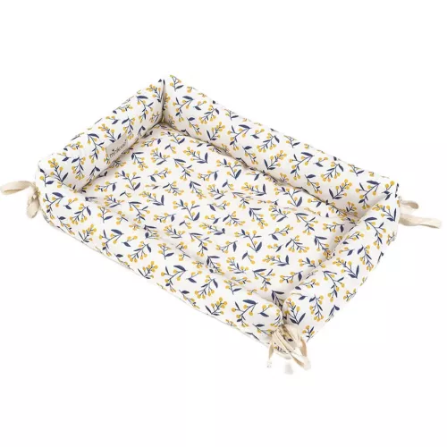 Het verschoonkussen heeft een gebroken witte basiskleur en is versierd met een dessin van mimosa takjes.