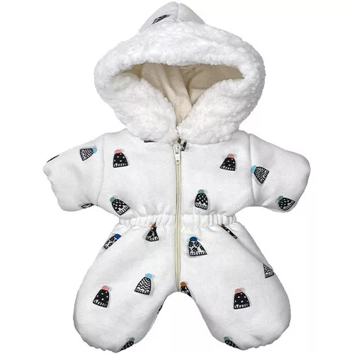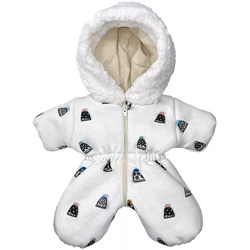 De gewatteerde poppenjumpsuit, met een dessin van mutsjes, heeft een capuchon met teddy rand en sluit met een rits.