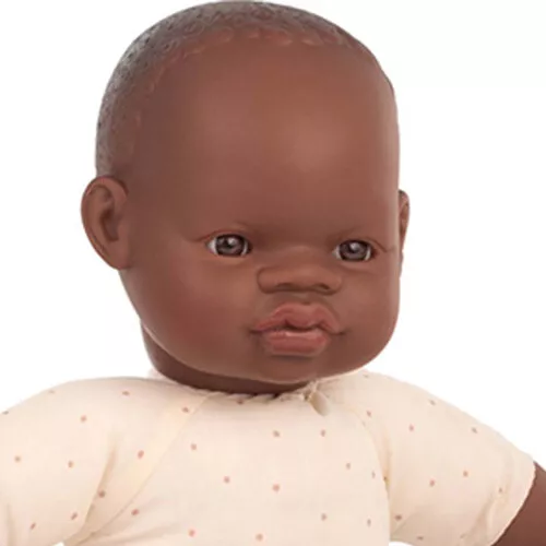 Deze knuffelpop ‘African Soft Body Doll’ van het Spaanse merk Miniland heeft een zacht, stoffen lijfje en een sprekend gezichtje met diepbruine ogen. Het gladde hoofdje, de armpjes en de beentjes zijn van vinyl en zijn beweegbaar. De speelgoedpop heeft de geur van een vleugje vanille.