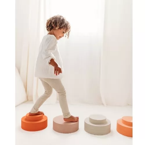 Door hun ronde vorm en harmonieuze kleuren laten deze stapstenen zich uitstekend combineren met de andere speelblokken en balanceerfiguren van Moes Play.