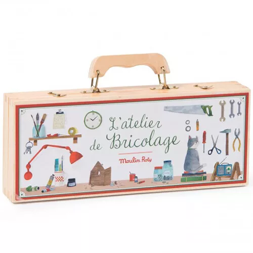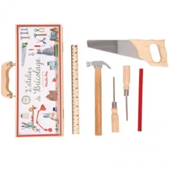 Een houten kindergereedschapskist van het Franse merk Moulin Roty, waar kleine klussers direct mee aan de slag kunnen. Alle klusjes in huis zijn zo opgeknapt! Echt gereedschap om mee te zagen en meten en een goede motoriek te ontwikkelen.
