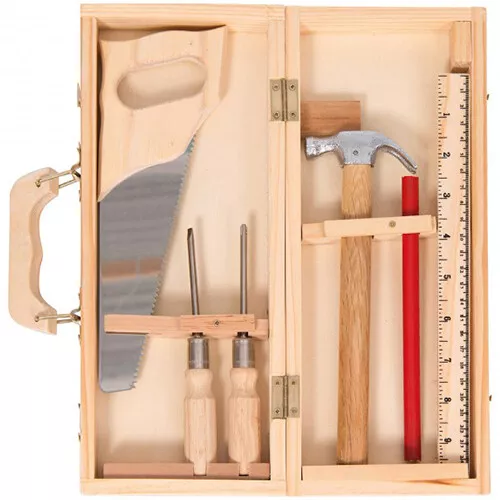 De 7-delige set bestaat uit een gereedschapskoffer, zaag, hamer, meetlat, potlood, platte schroevendraaier en kruiskopschroevendraaier.