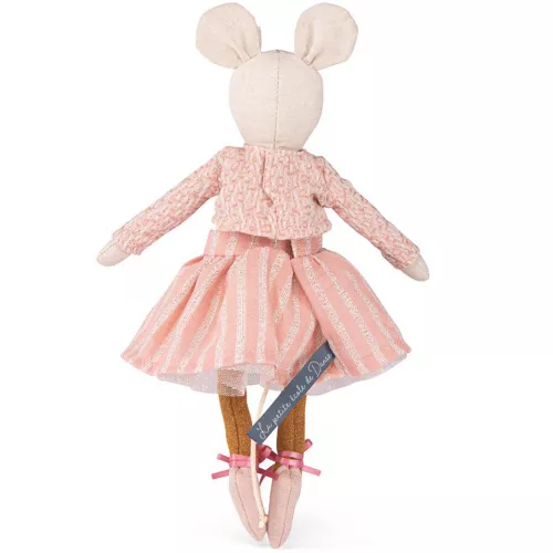 Deze hartveroverende knuffelmuis ‘Poupée Souris Anna’ is een danseres uit de collectie ‘La petite école de danse’ van het Franse merk Moulin Roty. De muizenknuffel van chambray is feestelijk uitgedost in haar roze danskleding met ballerina’s.