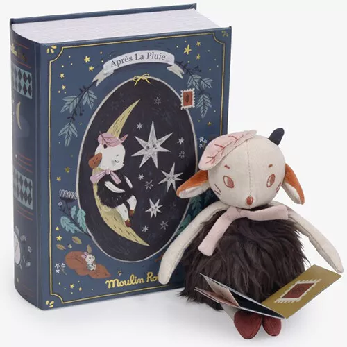 In de sfeervol geïllustreerde doos ‘Beautiful night book’ uit de ‘Après la Pluie’ serie van het Franse merk Moulin Roty ligt Réglisse, het knuffelschaapje te slapen. Het schapenknuffeltje ligt zoet op haar badstofmatras met dekentje en wolkenkussentje. In haar prentenboekje zonder woorden staan betoverende verhaaltjes.