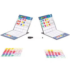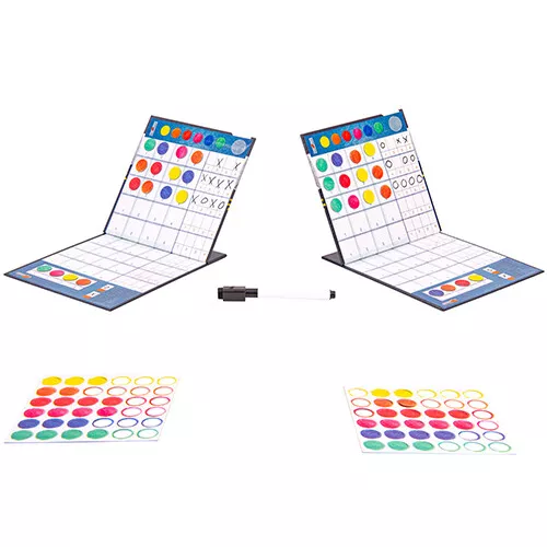 Plaats de gekleurde magneetjes op het speelbord en de tegenstander gebruikt de uitwisbare stift om met rondjes en kruisjes aan te geven of je op het goede spoor bent.