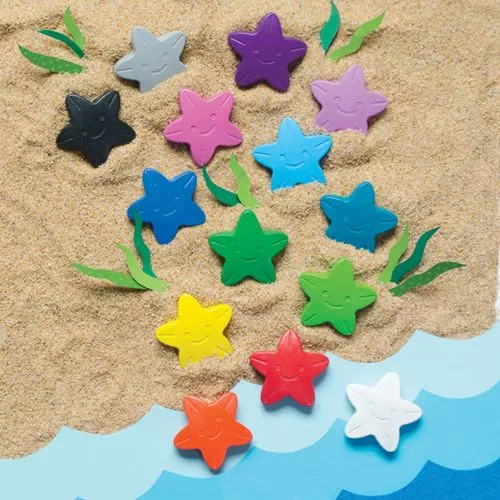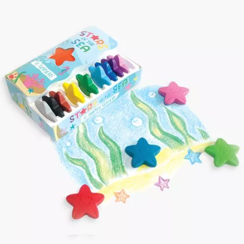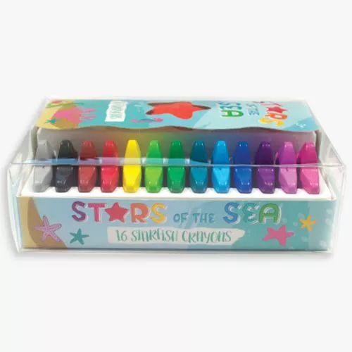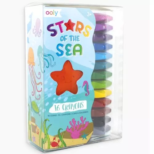 Een set van 16 stervormige wascokrijtjes ‘Stars of the Sea’ van het Amerikaanse merk Ooly. Dat ligt prettig in de kinderhand. Elk zeesterkrijtje heeft een lach op zijn gezicht.