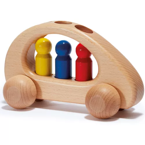 Laat deze houten speelgoedauto van het Duitse merk Ostheimer vrolijk door de kamer rollen. Speelgoed dat met zijn stylistische vormgeving en kleurrijke passagiers direct tot de verbeelding spreekt van de kleine peuter. De drie passagiers kunnen door de openingen in het dak in de auto geplaatst worden.