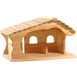Een handgemaakte, naturel houten speelgoedstal van het Duitse merk Ostheimer, om mee te spelen of als decoratie op de seizoenstafel. De stal kan gebruikt worden als onderkomen voor boerderijdieren en verandert rond Kerstmis in een kerststal.