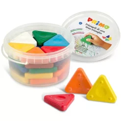 Dertig stevige, driehoekige waskrijtjes in 10 verschillende kleuren van het Italiaanse merk Primo. Door hun vorm zijn de waskrijtjes makkelijk vast te houden en stimuleert het de handvaardigheid.
