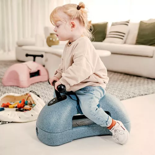 Onder de zitplaats zit een opslagruimte om speelgoed of een knuffel mee te nemen. Doordat de voorwielen 360 graden kunnen draaien is het makkelijk te bewegen door de ruimte.
