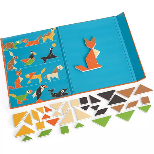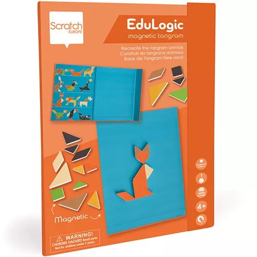 Leer de geometrische vormen combineren en maak kleurrijke dieren met dit fantasierijke magneetboek uit de ‘EduLogic Tangram Dieren’ van het Belgische merk Scratch Europe.