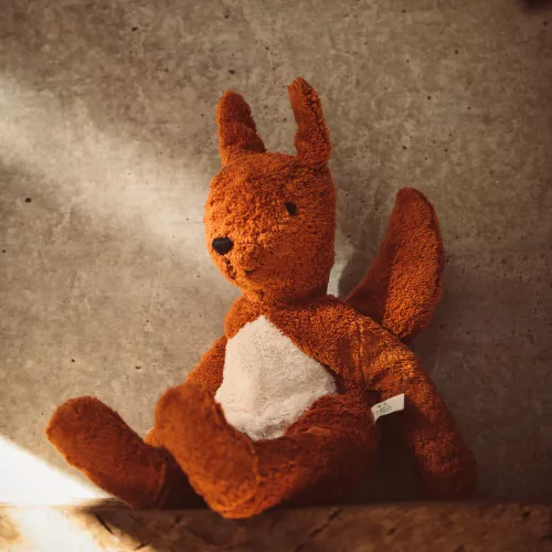 De handgemaakte eekhoornknuffel van katoenen pluche heeft een stevige kop met geborduurde oogjes. De eekhoorn is gevuld met lamswol.Â