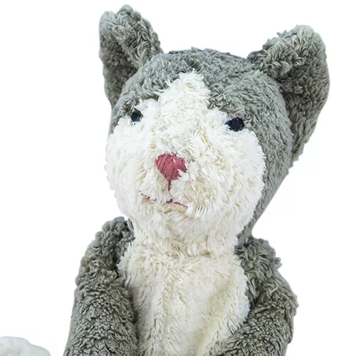 De handgemaakte knuffel van grijze-witte katoenen pluche heeft een stevige kop met geborduurde oogjes en snuit. Het knuffeldier is gevuld met lamswol en kan zelfstandig zitten.