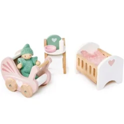 Een ‘Dovetail Nursery Set’ met onmisbare accessoires van het Engelse merk Tender Leaf Toys om de poppenhuisfamilie compleet te maken. Deze houten speelgoed babykamer set bestaat uit een lief peuterpopje in een mintkleurig gebreid pakje en stijlvolle poppenmeubels.