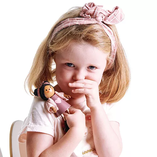 Het speelgoedpopje met een hoogte van 12 cm heeft een ideaal formaat voor de poppenhuizen van Tender Leaf Toys.
