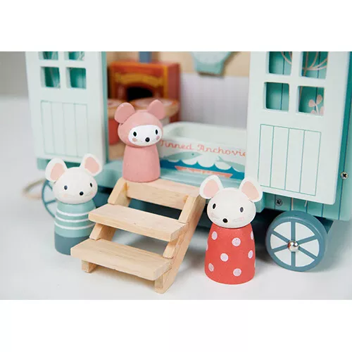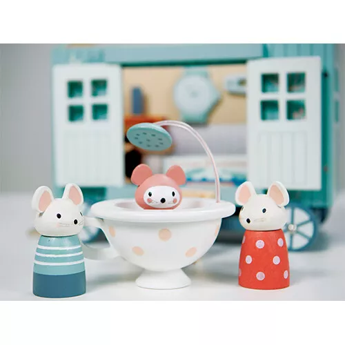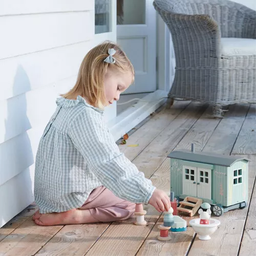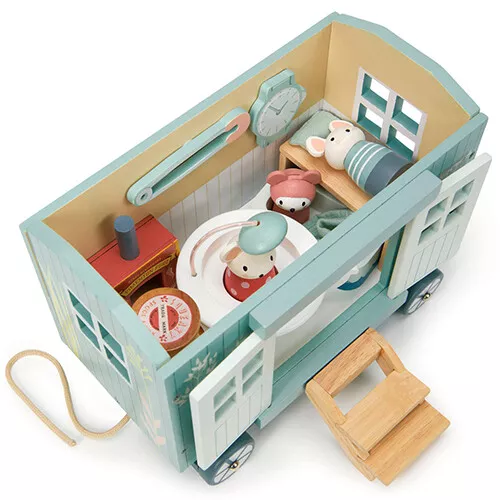 De nostalgische herdershut ‘Secret Meadow Shepherd’s Hut’ van het Engelse merk Tender Leaf Toys is een knusse woonwagen waar familie muis is ingetrokken. Het speelgoed poppenhuisje op wielen heeft twee openslaande deuren, een trappetje en twee raampjes. Daarnaast heeft de woonwagen een dak dat er af kan om overal goed bij te kunnen en kan hij voortgetrokken worden aan het koordje.