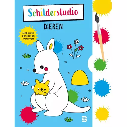 Een kleurboek ‘Schilderstudio – Dieren’ van uitgeverij Ballon met een penseel en op elke pagina vier kleuren waterverf.