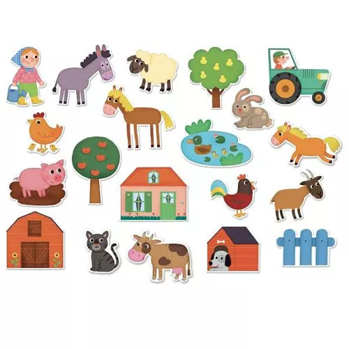 Met deze set van 20 houten boerderij magneten van het Franse merk Vilac kan een heel verhaal gemaakt worden op de koelkast of het magneetbord.